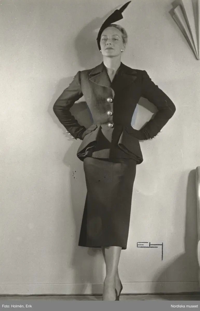 Nordiska Kompaniet. Kvinna i mörk dräkt med åtsittande kavaj och snäv kjol. Mörk hatt med fjäder. Text på baksidan: "Robert Piquet, svart kläde Hösten 1949",.