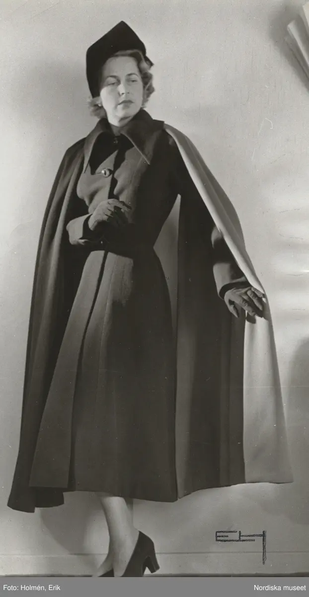 Nordiska Kompaniet. Kvinna i mörk kappa med vidhängade cape. Mörk hatt, mörka handskar. Text på baksidan: "Paquin Hösten -49"