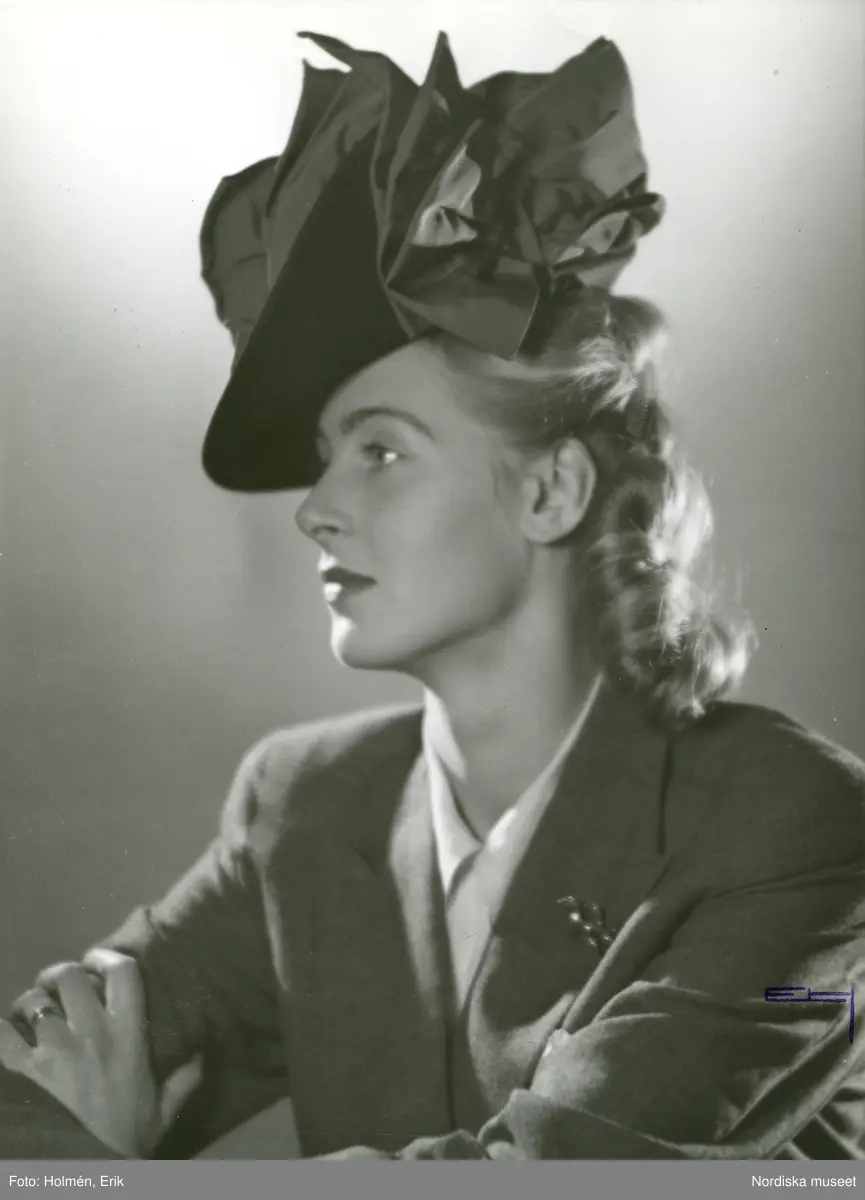 Porträtt av kvinna klädd i hatt med dekorband på sidan, mörk kavaj och brosch.
