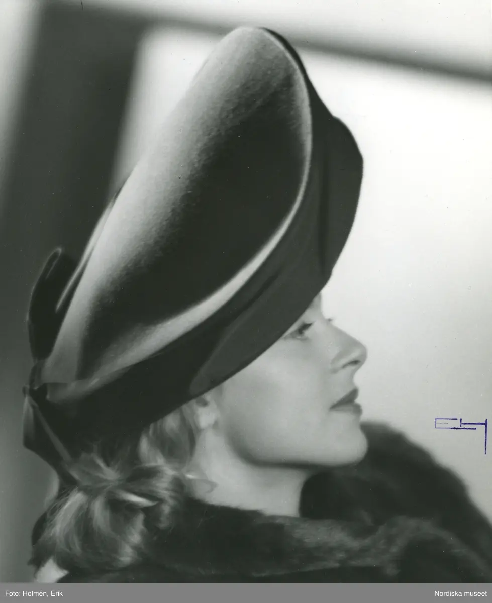 Porträtt av kvinna i hatt med rosett av Jacques Fath.