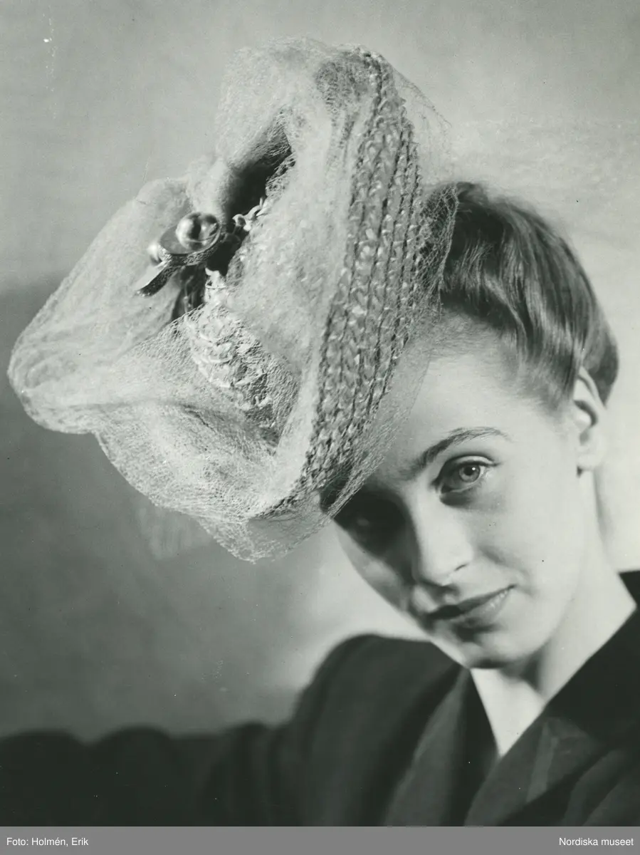 Porträtt av kvinna i stråhatt, garnerad med tyll, ringar och kulor.