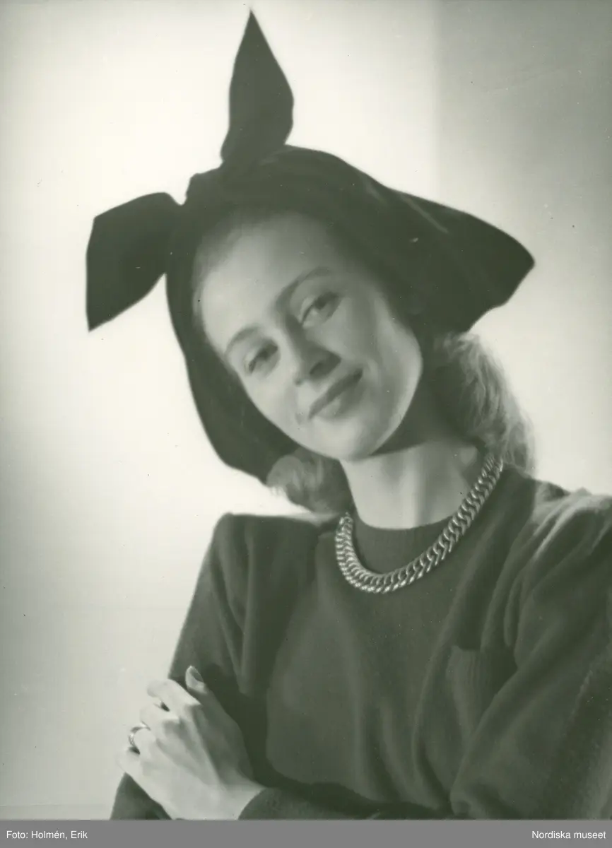 Porträtt av kvinna i hatt med stor rosett, mörk överdel med axelvaddar, samt halsband.