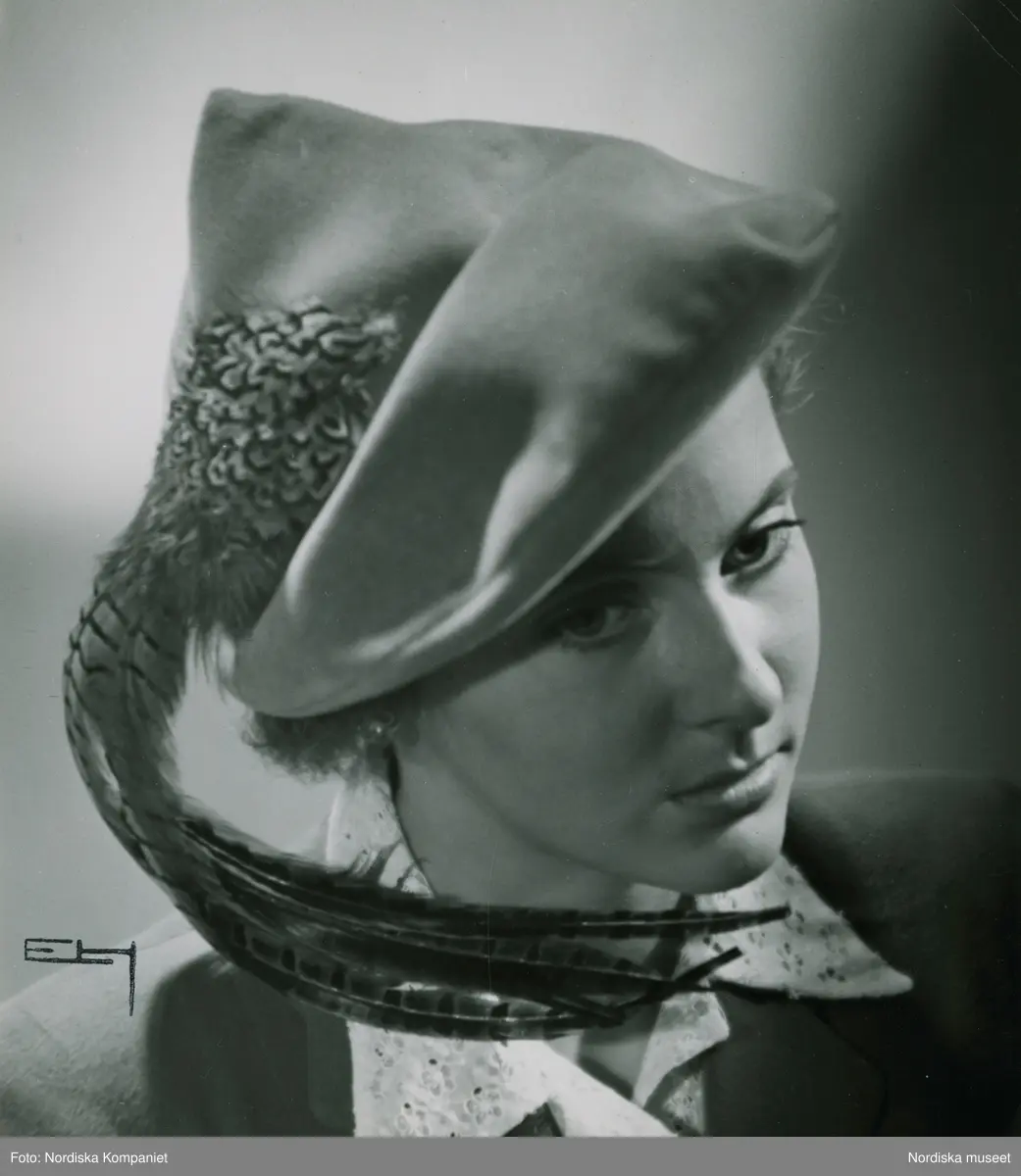 Porträtt av modell i senapsgul velourhatt med fasanfjädrar. Från Maison Gilbert Orcel.