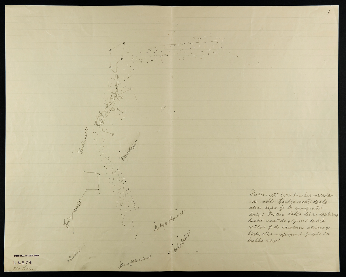 Skilda lappmarker. Teckning av Johan Turi. L.A. 874 nr. 12 Stjärnhimmel med text på samiska.