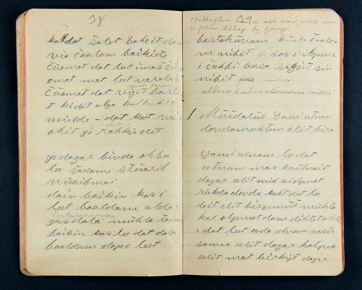 Fotografi av sida ur manus/anteckningsbok nr. 3 av Johan Turi till ”muittalus samiid birra”. Uppslaget sid. 38-39