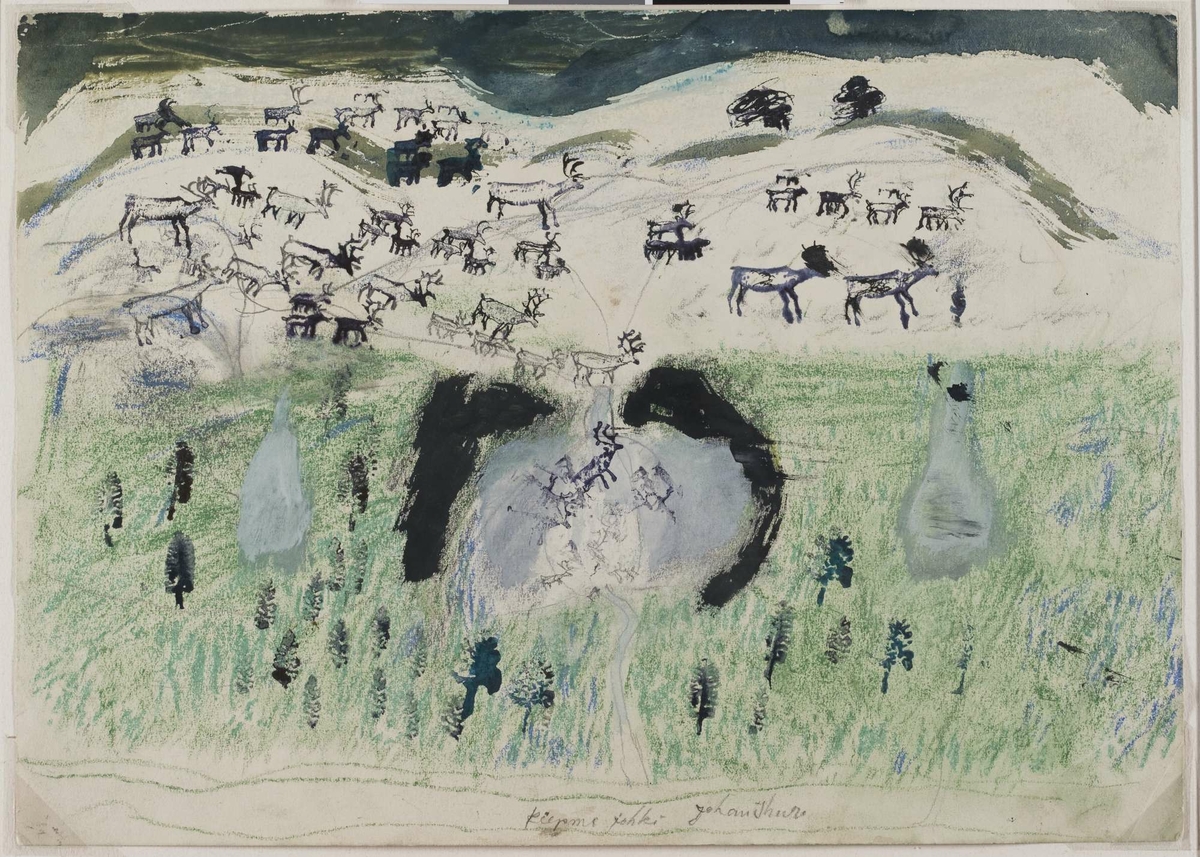 Teckning av Johan Turi. Krita och akvarell? Landskap med renar. "Kilpma johki"