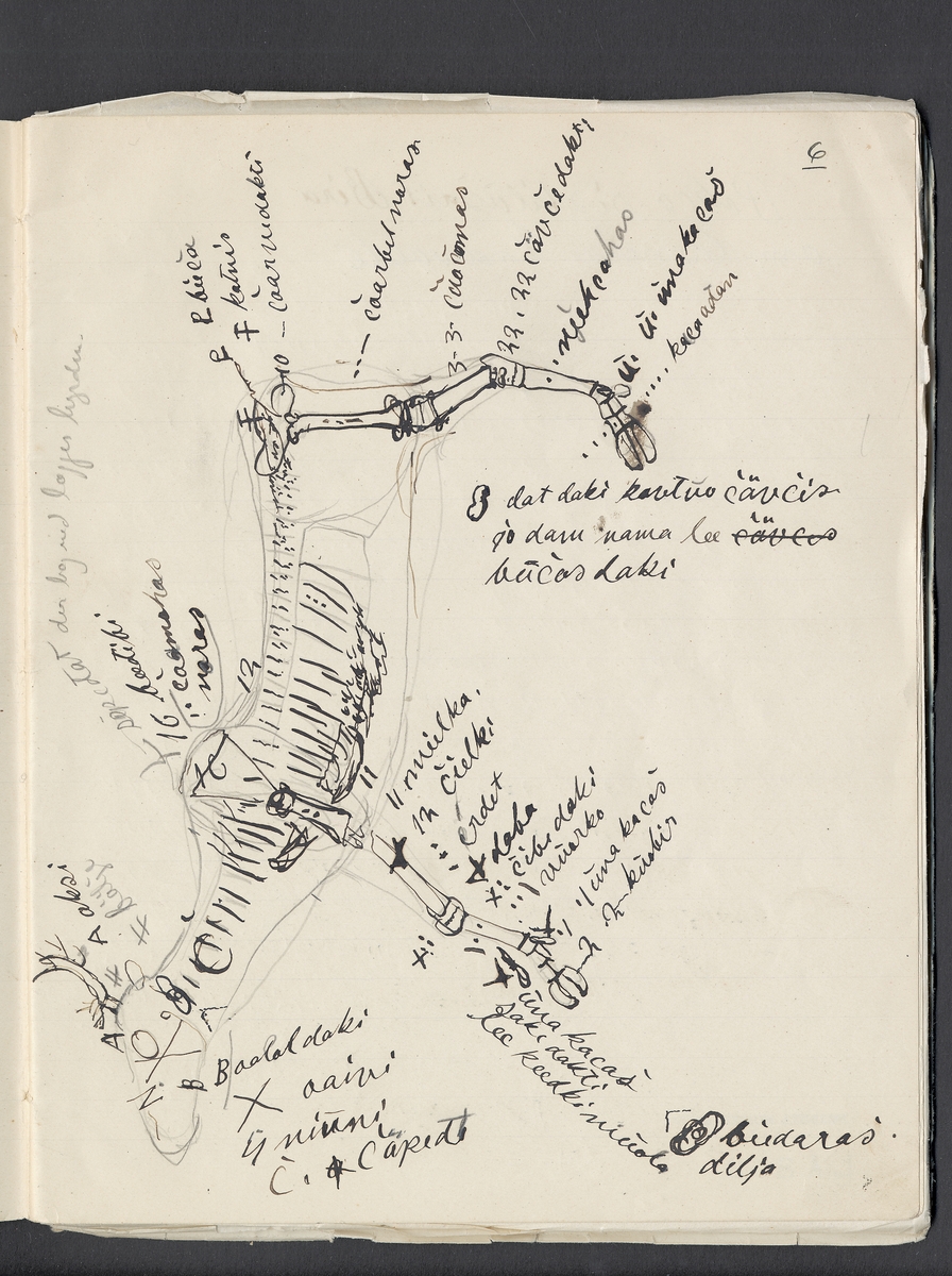 Uppslag ur manuskript/anteckningsbok med grönt omslag av Johan Turi, sidan 6. Teckning av renens olika delar.