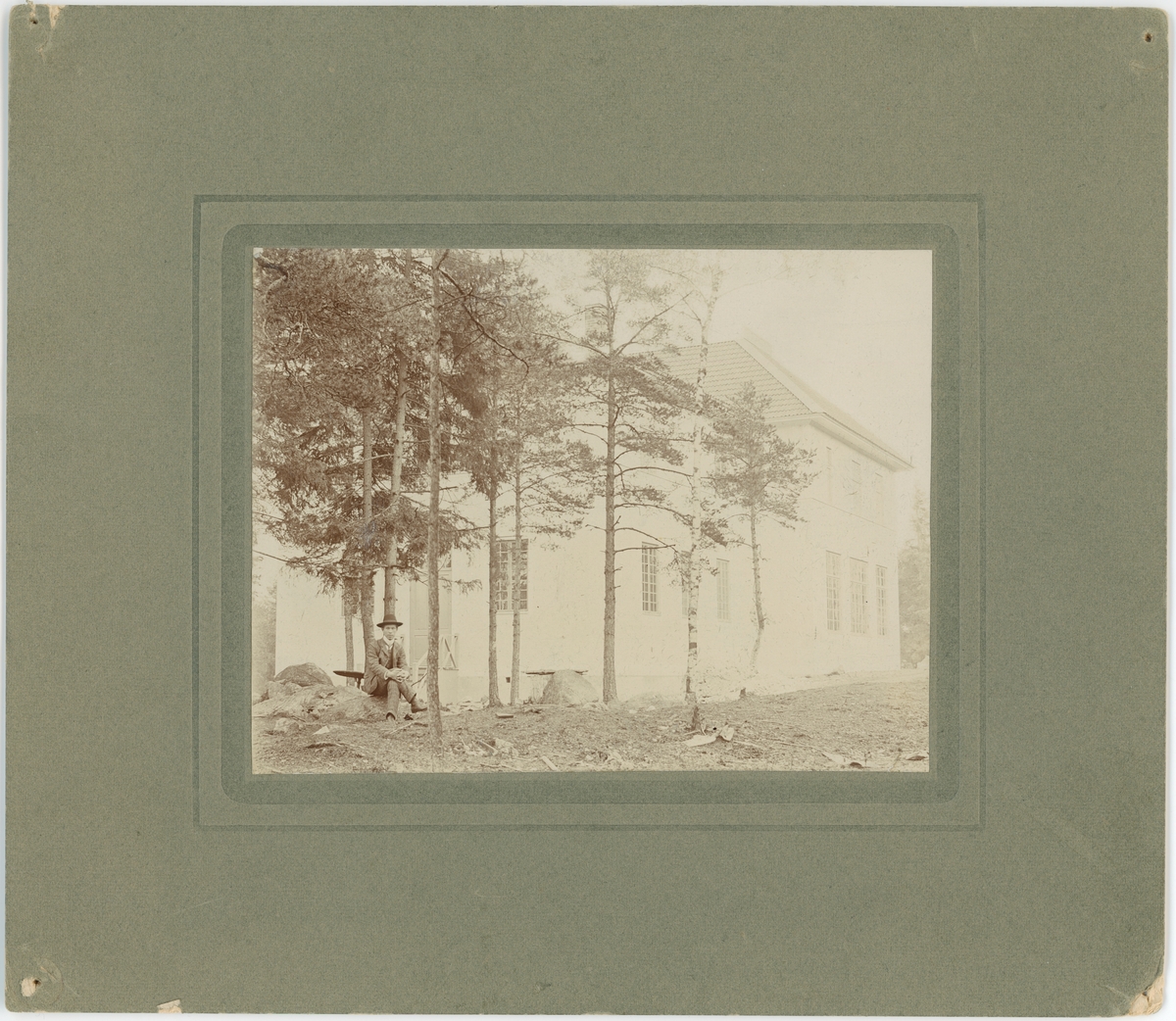 Man som sitter på en sten med en stor byggnad bakom sig, Uppsala