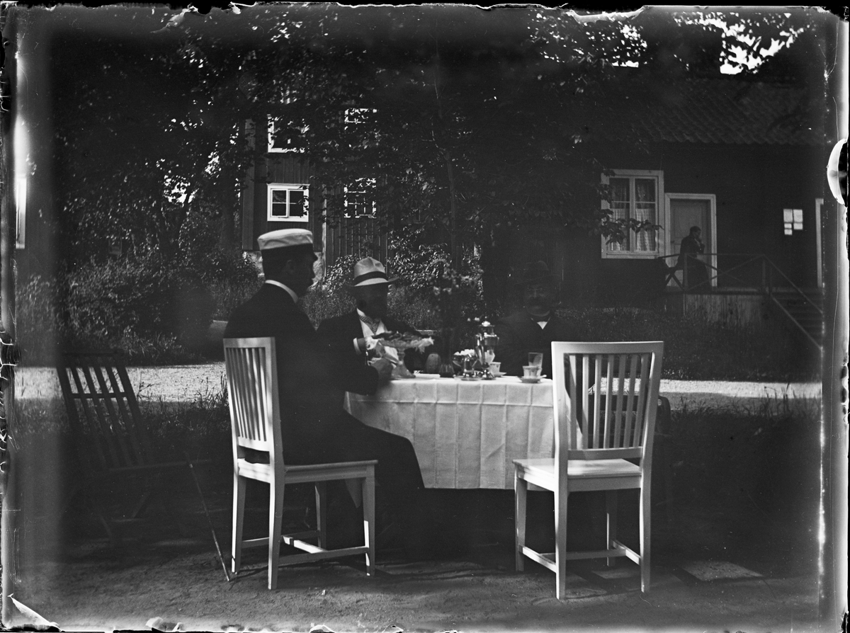 Två män vid kaffebordet i trädgården, Sätra brunn, Sala