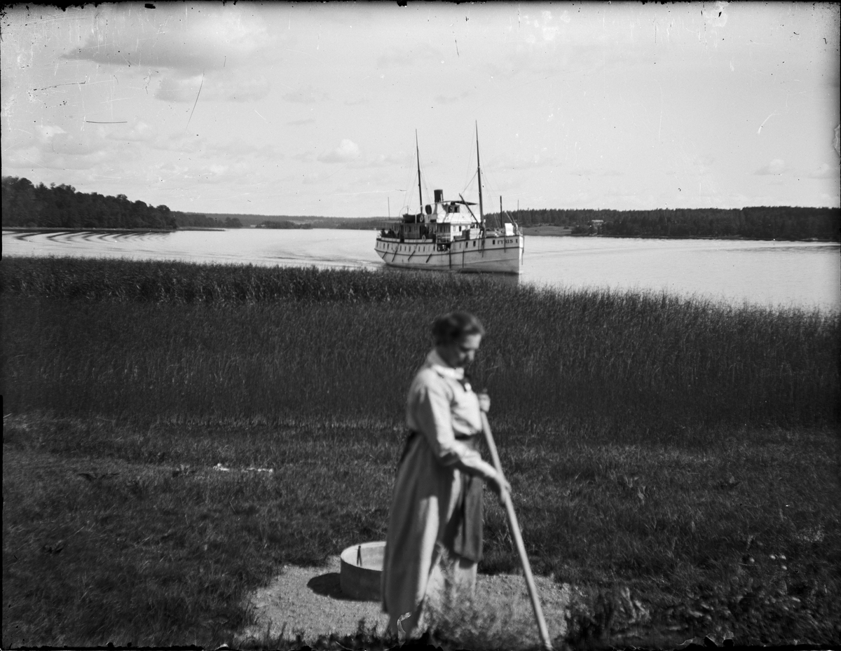 Kvinna och ångbåten Fyris I i bakgrunden, Uppland