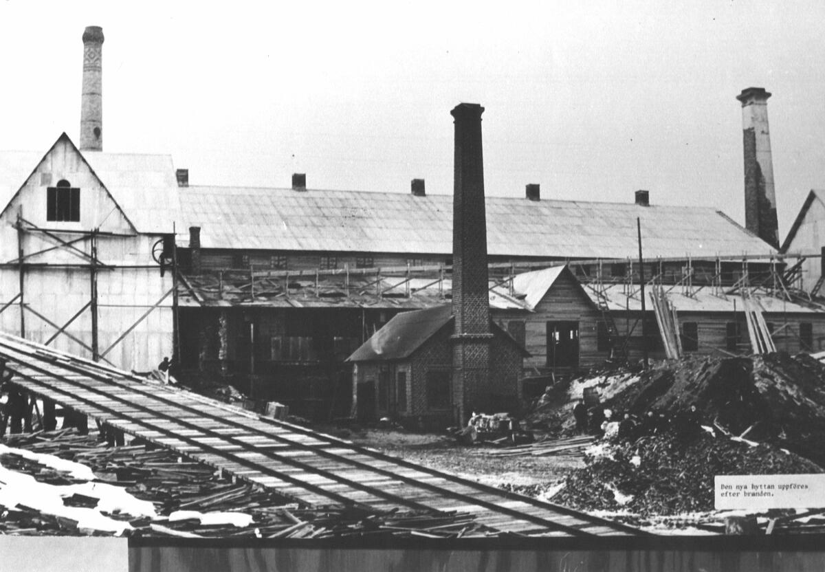 Efter branden 1904 började den nya hyttan uppföras på Sandö Glasbruk.