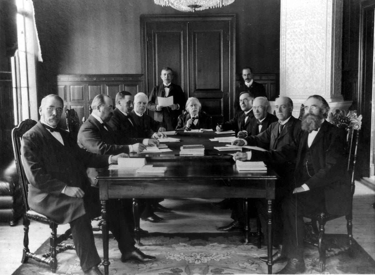 Västernorrlands läns landstings undervisningsutskott. I mitten sitter ordf. W.M. Carlgren, stående t.v. Högstrtöm, sittande t.v. Bucht t.h. sittande komm. Lundström.