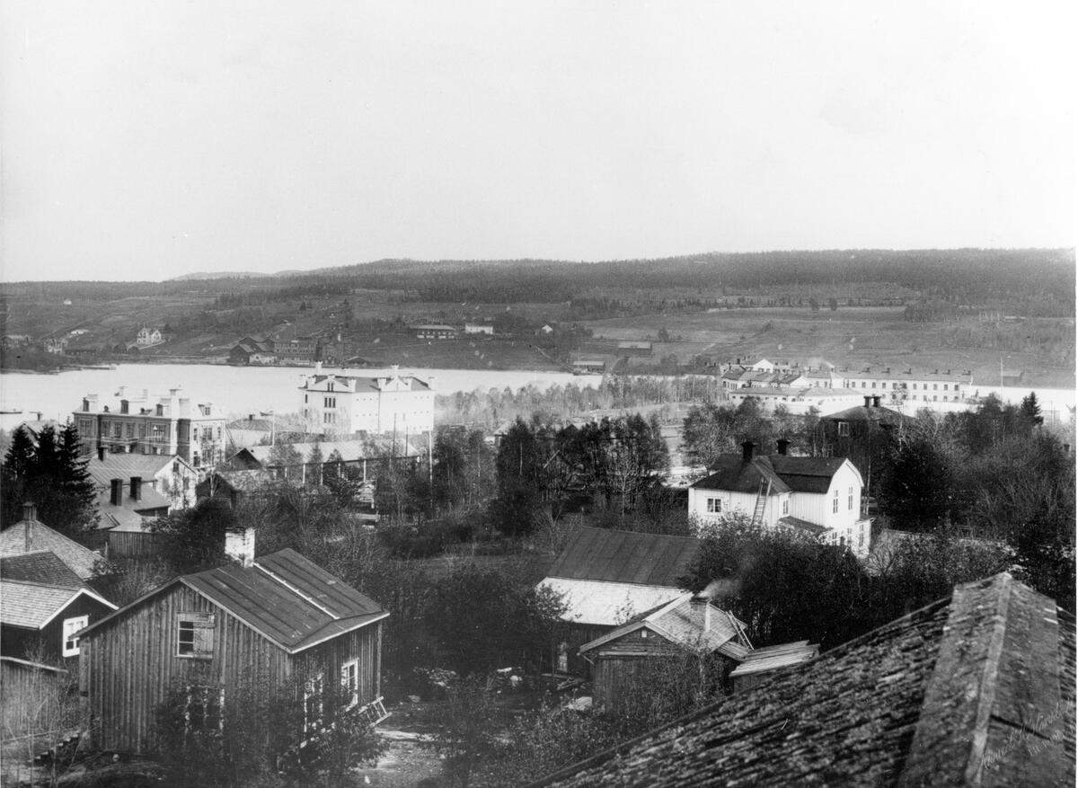 Utsikt mot SO. Det vita huset i förgrunden är Viktor Lundgrens trädgårdsmästeri. Utsikt från Gådeåberget Kv Lärkan.