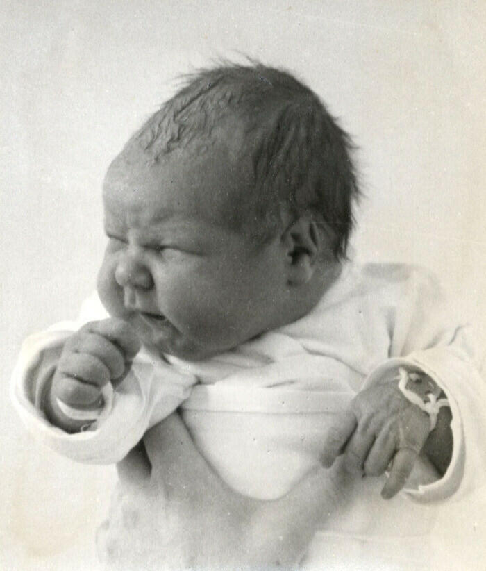 Barnet har en ID bricka runt handleden. Troligen 1940-talet.
