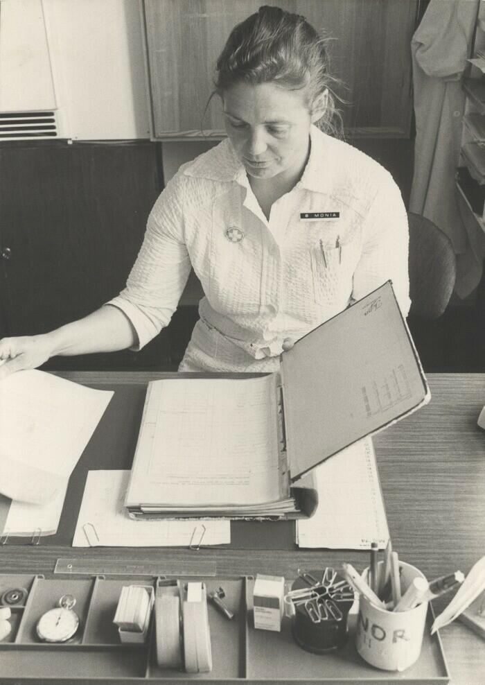 Syster Monia Gönzi utför administrativa patientuppgifter Ne 82