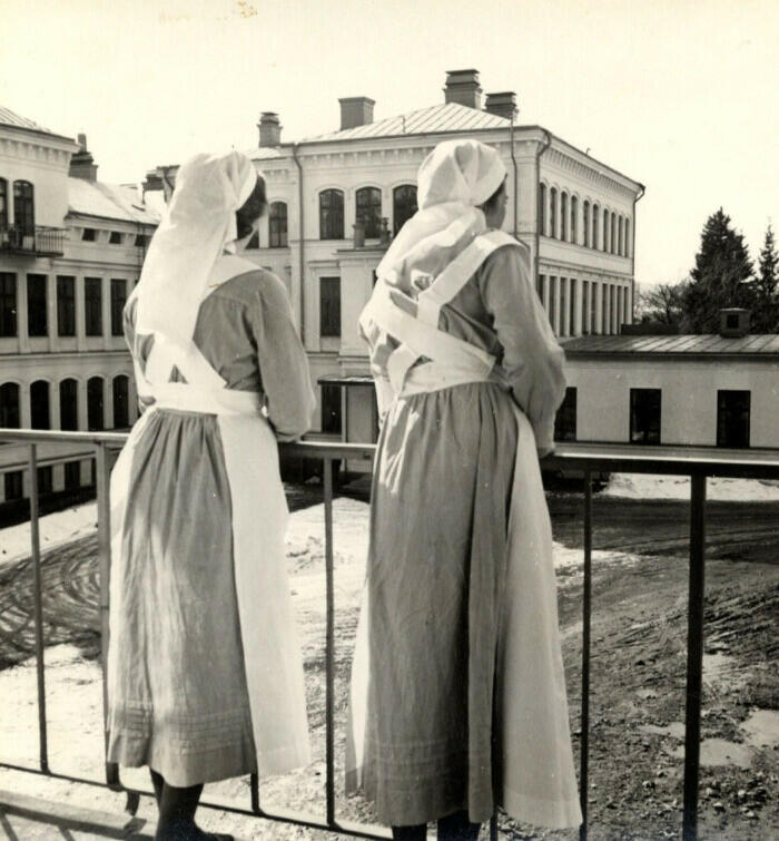 Bild från matsalsbalkongen med två sjuksköterskor ca 1930- 40 tal.