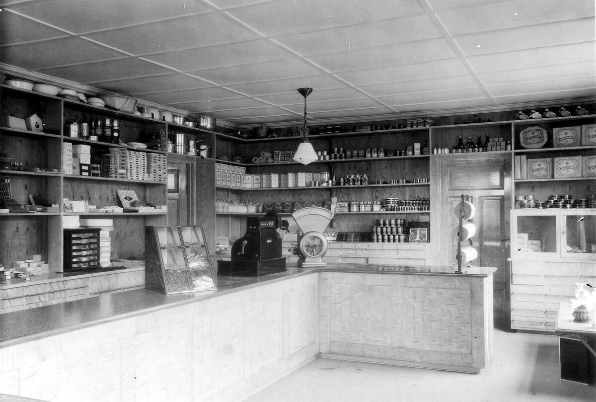 Affärsinteriör från omkring 1925-1935. Fotograferat av Åströms bokhandels vykortsfotograf, Härnösand.; ; Kommentarer från Hemsidan:; ; Av Ann-Mari Bäckman 2010-05-09 16:43:41; Troligtvis är detta den lanthandel, som min farfar Jonas Rudolf Forsgren född 31 juli 1881, Mo socken, Ångermanland, ägde.; ; Mitt emot hans affär uppfördes en Konsum-affär, men det kanske var senare och den benämndes väl inte som en lanthandel.; ; I boken Norra Ångermanland, Handel Hantverk, Industri av B Hallberg 1942, står under en bild av J R Forsgren att han öppnade rörelsen 1925 med firmanamnet:; J R FORSGRENS SPECERIAFFÄR; Norrmesunda Anundsjö.; ; J R Forsgren upphörde min sin affärsverksamhet ca 1947.; ; Av Ann-Mari Bäckman 2010-05-10 09:47:27; Min kusin Sven-Erik Forsgren, uppvuxen i Norrmesunda, Anundsjö, har bekräftat att det är den lanthandel, som vår farfar J R Forsgren ägde. Den siste ägaren till lanthandeln var Harry Hellström.