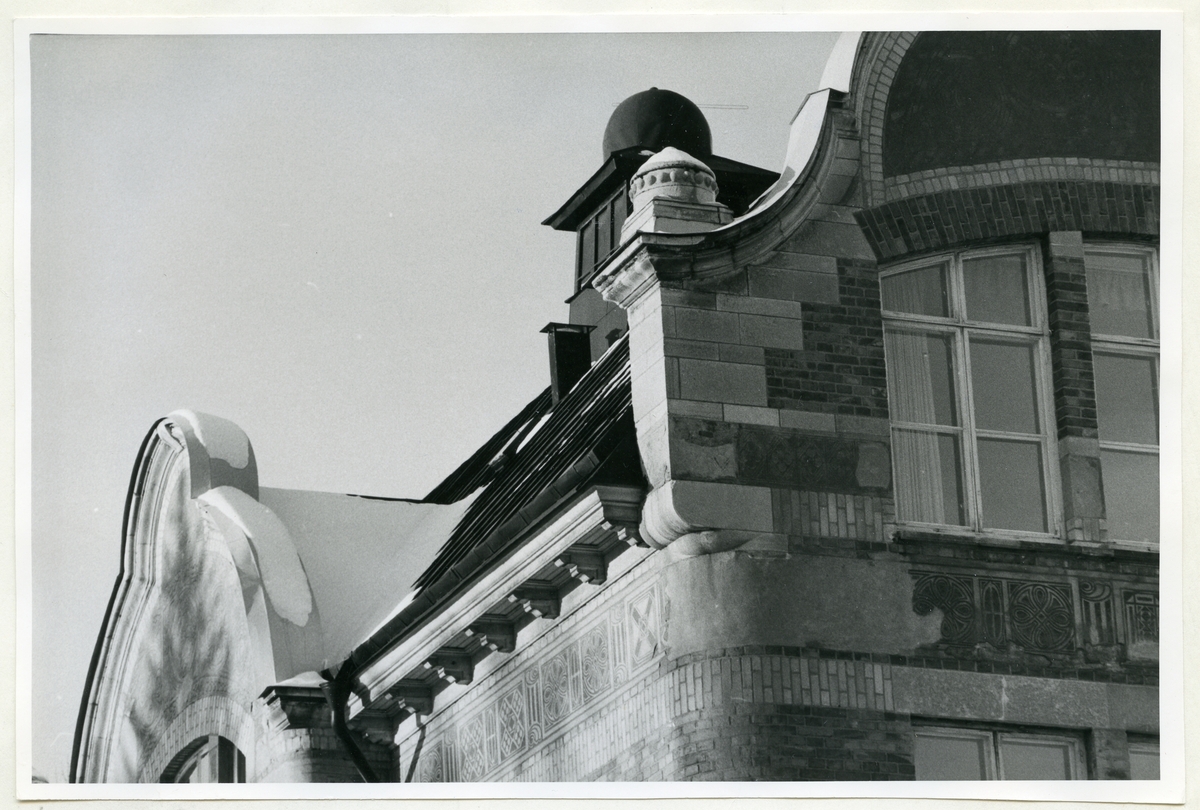 Engelbrektsgatan 19. Ett av hörnen uppe vid taket på Herrgärdsskolans huvudbyggnad.