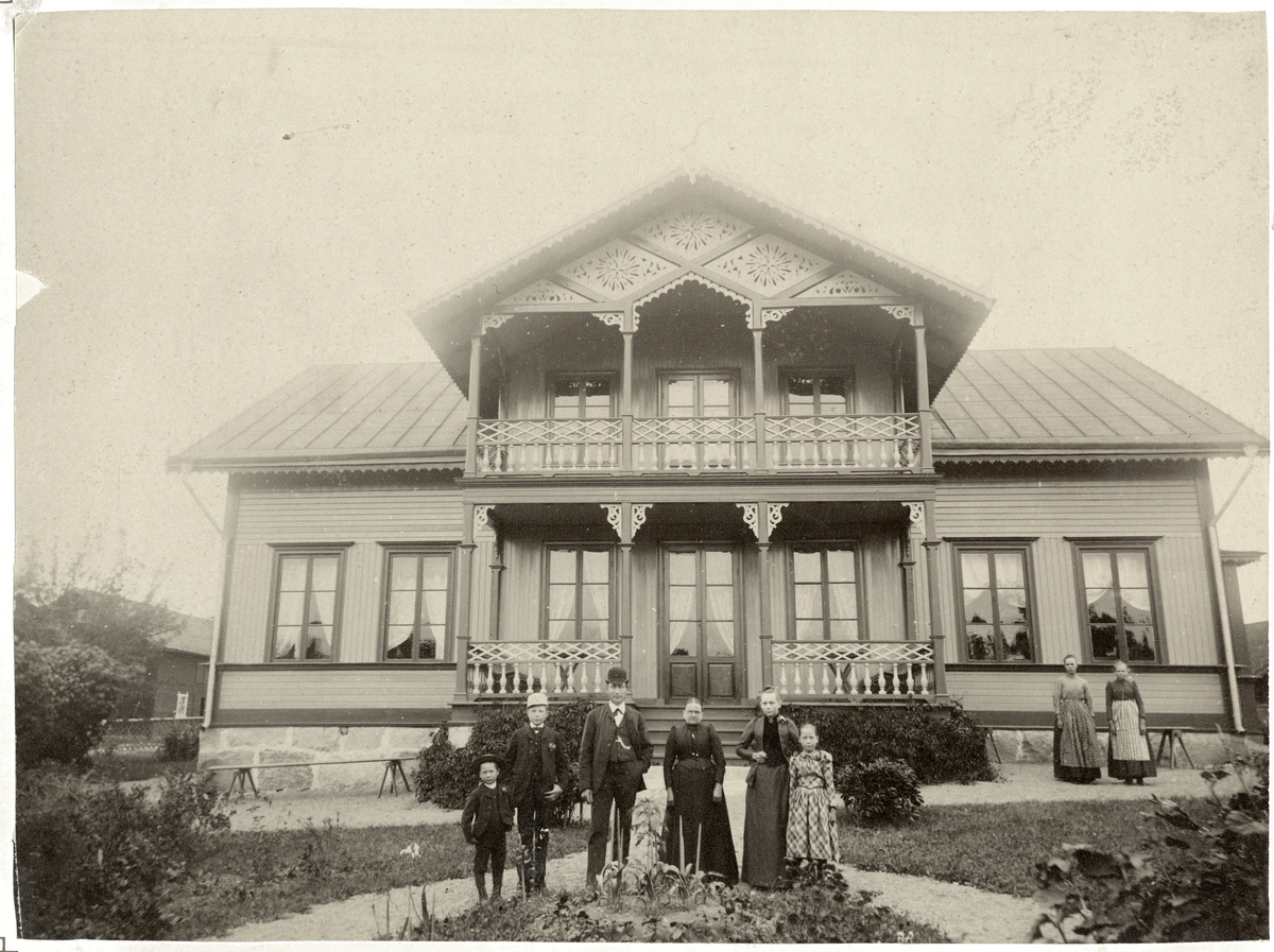 Titel: Dingtuna sn, Västerås kn. Familj framför Skogsta gård. C:a 1899-1900.