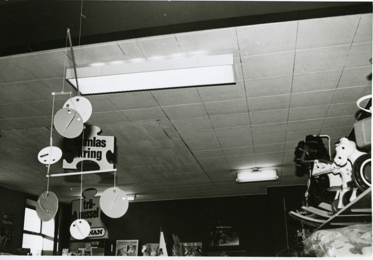 Inför renoveringen 1985. Del av dekorerat tak i affärslokal.
