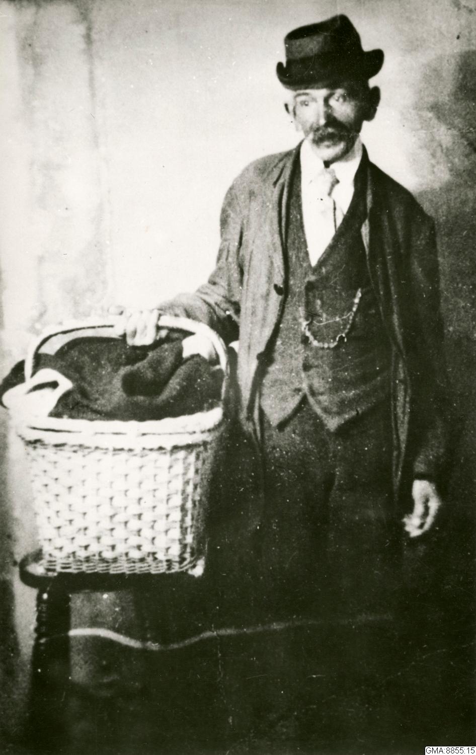 Vatten-Anton med sin korg, ett Göteborgsoriginal. Han bar vatten till hushållen i Majorna innan man dragit in vattenledning till bostadshusen.