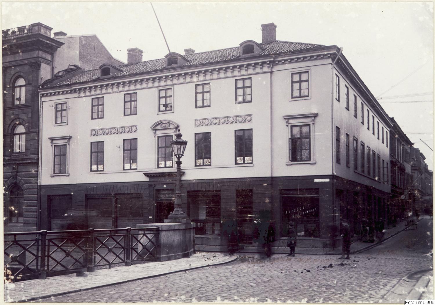 Utsikt från Tyska bron mot Södra Hamngatan och Korsgatan med Blidbergska huset. Namnet efter handelsman Peter Blidberg som köpte huset är 1833 och använde bottenvåningen som lokal för klädbutiken Blidberg & Strindberg från 1857.
