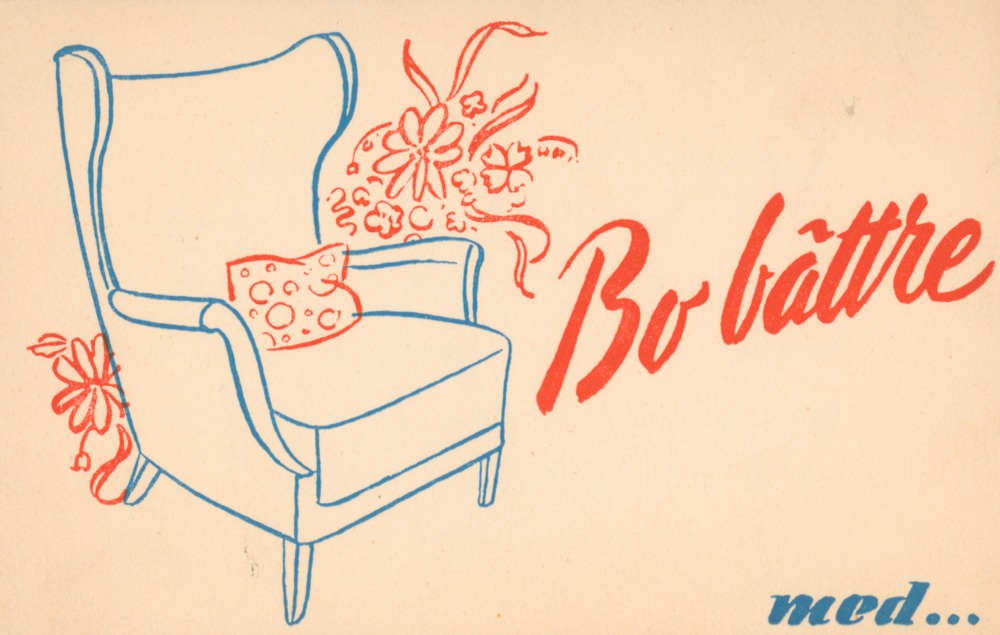 Är egentligen ett föäremål. Ett brevkort med reklam för möbelföretag. På framsidan en fåtölj med kudde och omgiven av blommor. Där står Bo bättre med... På insidan står följande text "Vi har här i Hälsingborgshem velat visa ett litet prov på vår stil. Men det skulle glädja oss mycket om vi också i vår affär vid Hälsovägen (S:t Jörgens Plats kunde få tillfälle att presentera för Er just sådana möbler som en modern nutidsmänniska behöver". "Det är god ekonomi att köpa möbler i Möbelhallen -fråga Edra Vänner så skall Ni få höra .... Ett besök lönar sig många gånger om!" Möbelhallen L Truedsson. Hälsovägen 5 (S:t Jörgens Plats Tel 211 44. På kortets baksida finns en liten karta med en röd prick för platsen och med omgivande gator.