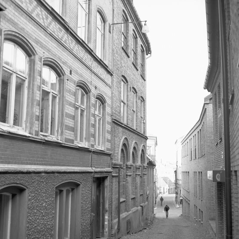 Bilden föreställer en lång smal stadsgata med flervåningshus på båda sidor.