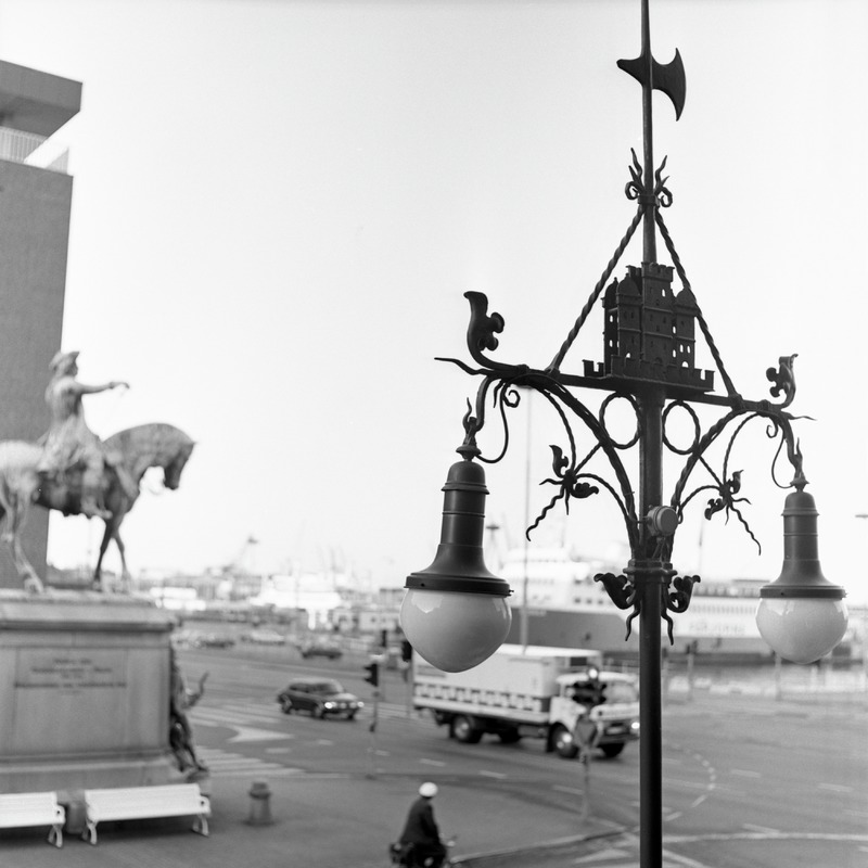 I förgrunden en lyktstolpe rikt smyckad av smideskonst. I bakgrunden stadgata med bilar. Till vänster Magnus Stenbockstatyn.