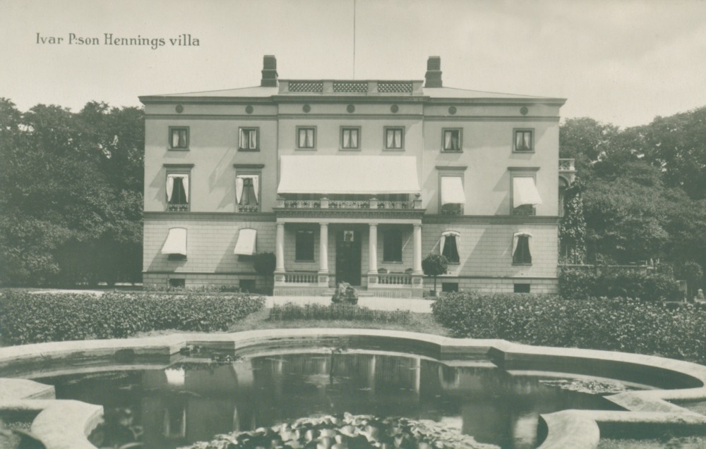 Bilden föreställer en trevåningsvilla i en park. I förgrunden en damm omgiven av en låg mur samt buskar