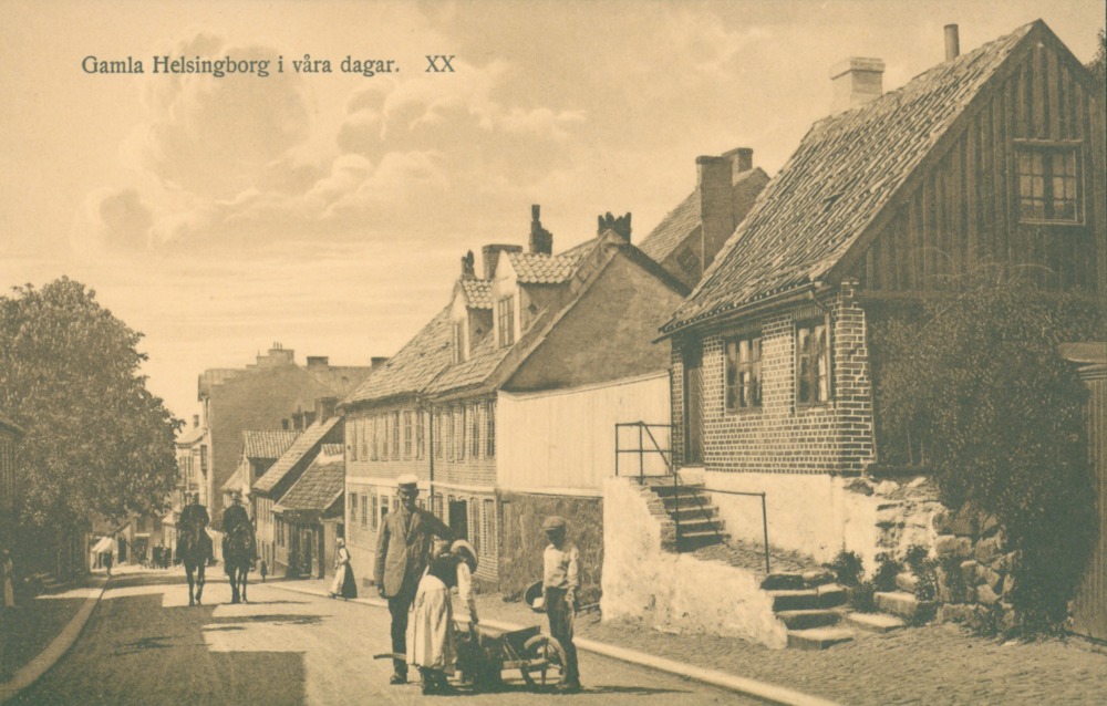 Bilden föreställer en stadsgata. På höger sida olika byggnader en- och tvåvåmigs, det första med trappa. På gatan man och barn vid kärra. I bakgrunden två ridande poliser (?). Till vänster träd.