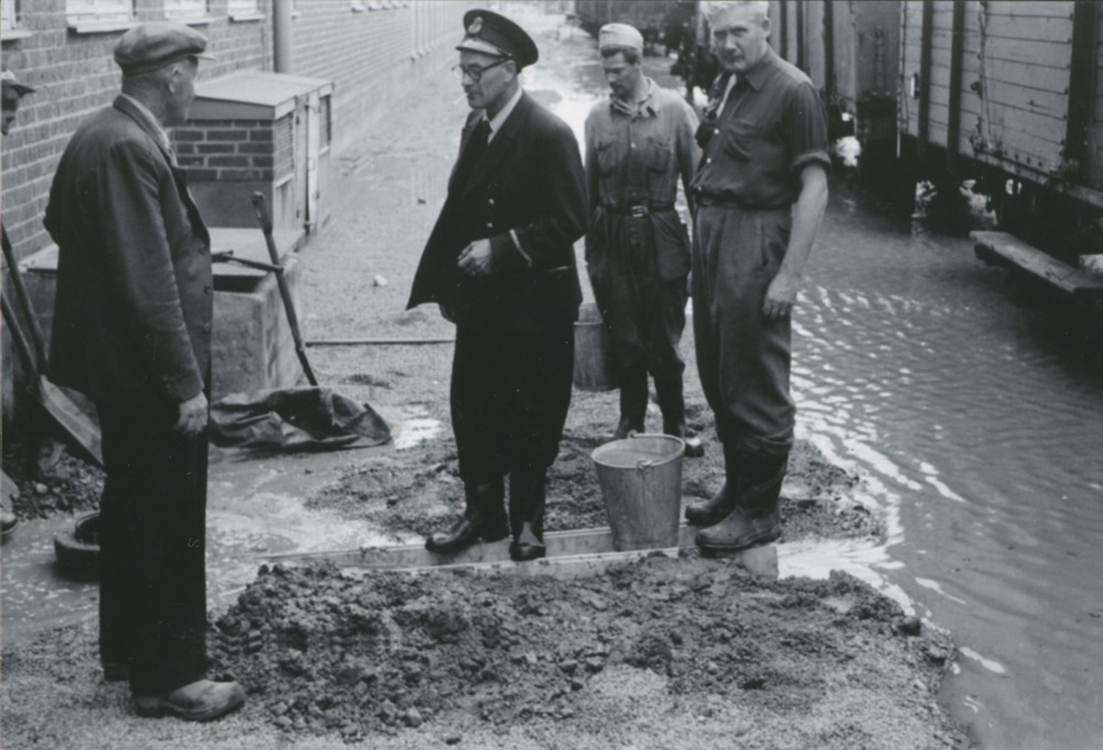 Bilden föreställer fyra män varav en i uniform som står vid en hög med lera, till höger vatten. I bakgrunden byggnad och järnvägsvagn.