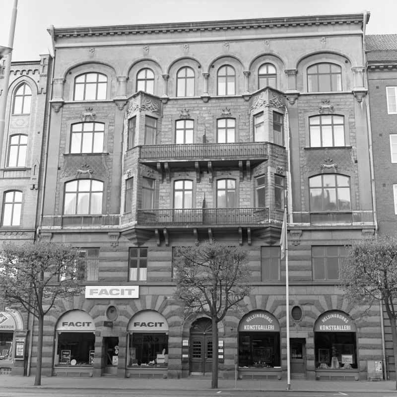 Bilden föreställer ett femvåningshus med butiker i bottenplanet. Framför huset trottoar och träd. På skyltar står det "Facit" och "Helsingborgs konstgalleri"
