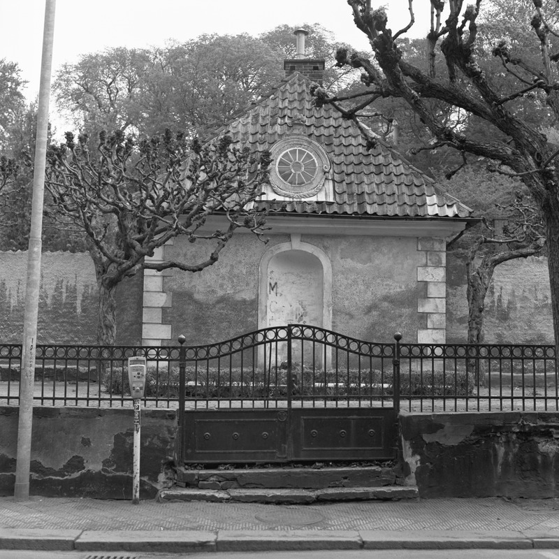 I förgrunden trottoar och mur med smidesstaket ovanpå. Mitt i bild en trappa och en smidesgrind. Där bakom träd och en hög mur med en liten byggnad i mitten med plats för en skulptur??