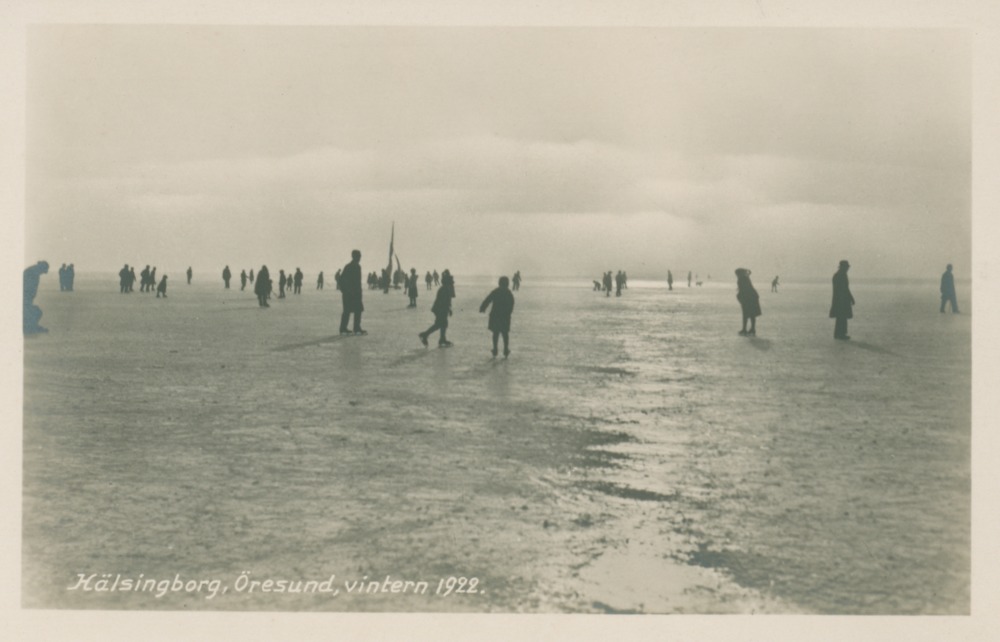 Bilden föreställer ett istäckt Öresund, med många människor som går eller åker skridsko