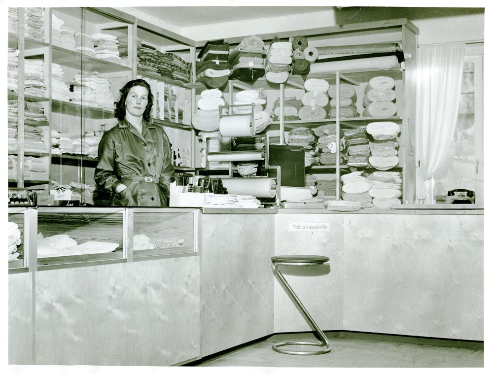Fotografi, föreställande Stattena Inköpsförenings butik. Interiörbild med ett kvinnligt affärsbiträde stående för porträtt. I textil avdelning, men stora tygrullar liggande på väggfasta hyllor bakom disken.