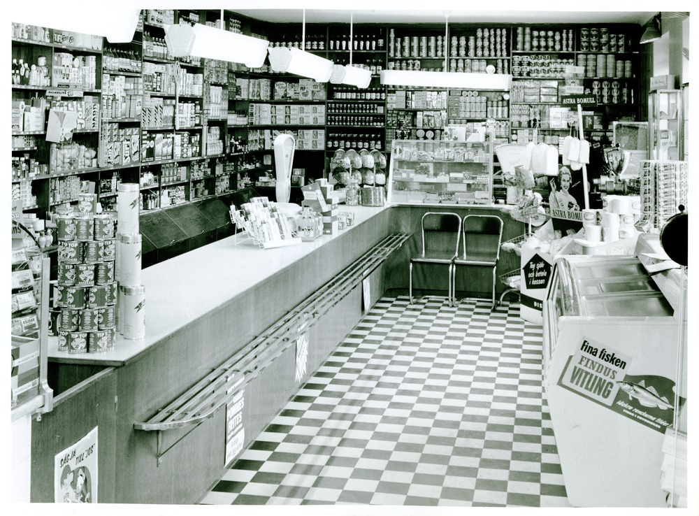 Fotografi, föreställande Stattena Inköpsförenings butik. Interiörbild med affärsdisk. Bakom disken väggfasta hyllsystem fyllda med varor. På affärsdisken en analog våg, flera varor och en glasmonter med varor. Golvet i butiken schackrutigt.