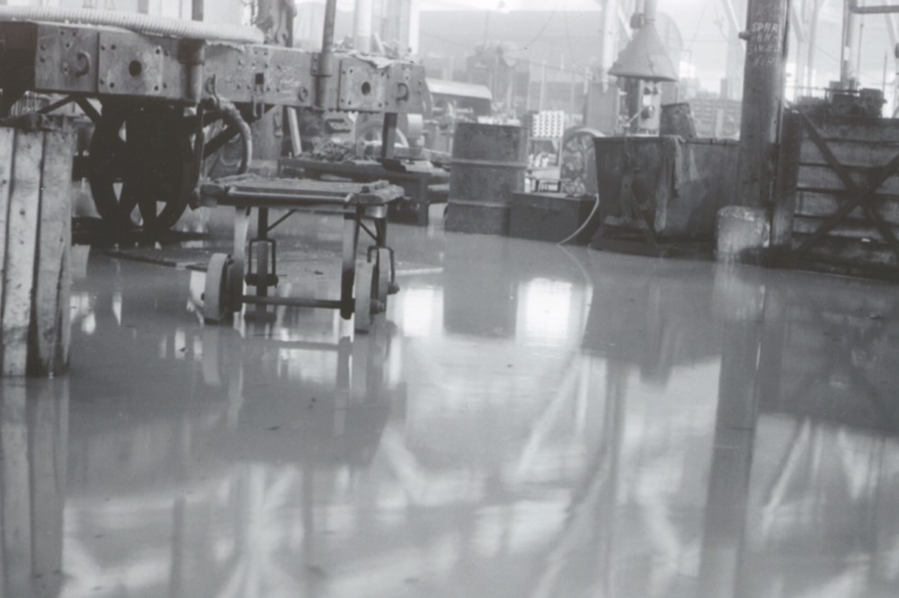 Bilden föreställer en vattenfylld industrilokal med ospecificerad utrustning.