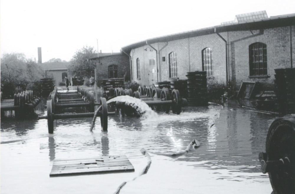 Bilden föreställer en vattenfylld yta med hjupar till järnvägsvagnar. I bakgrunden och till höger industribyggnader.