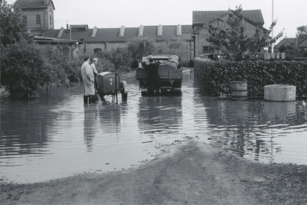 Bilden föreställer en vattenfylld yta. Där står en vagn meden tank och två män, samt en lastbil. I bakgrunden buskage och industribyggnader.