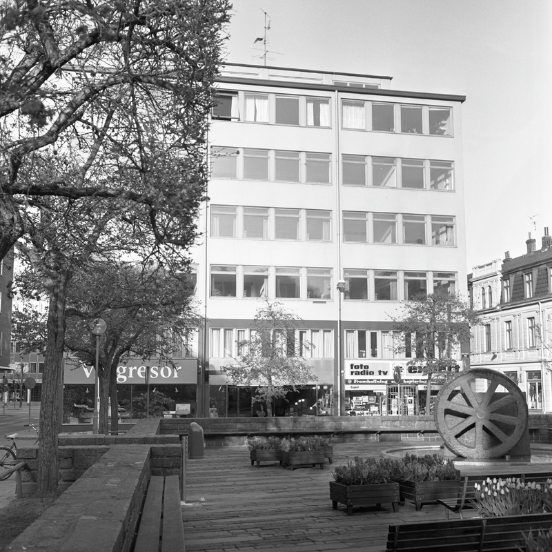 I förgrunden torg med skulptur iform av hjul samt murar och träd. I bakgrunden sexvåningsbyggnad med butiker i bottenplanet. På skyltar står det "Vingresor", "foto radio tv expert" "Framlkallning och kopiering".