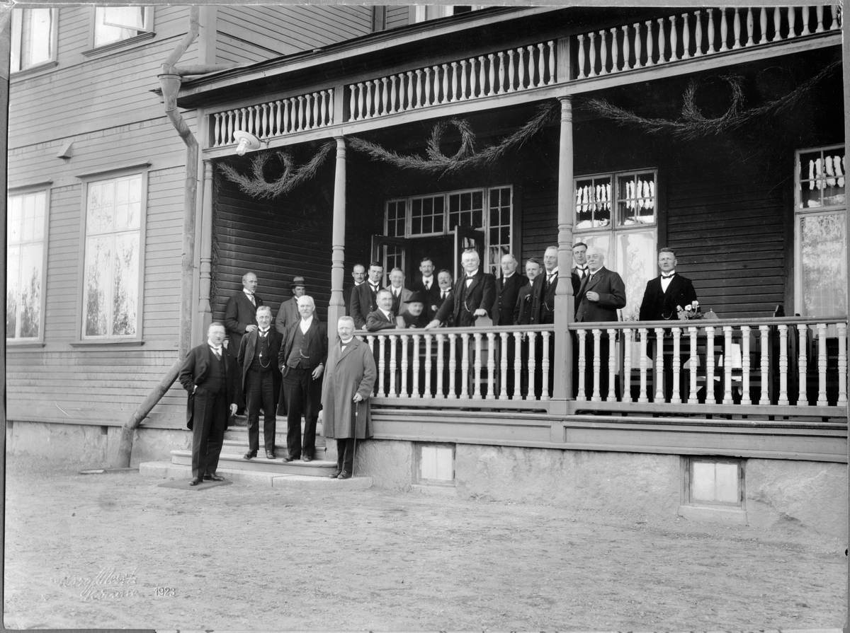 Malmbanans elektrifiering. Besiktningsresa Svartön - Riksgränsen - Narvik. Högre tjänstemän fotograferade framför hotell Kirunavaara.