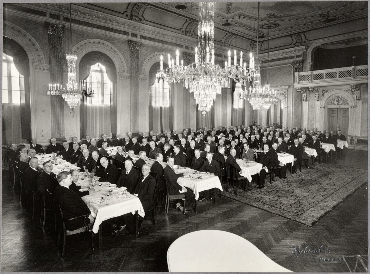 Statens Järnvägar, SJ:s personal och inbjudna gäster vid invigningslunchen på Grand Hotell i Jönköping. Det firas invigningen av Borås - Ulricehamn Järnväg.