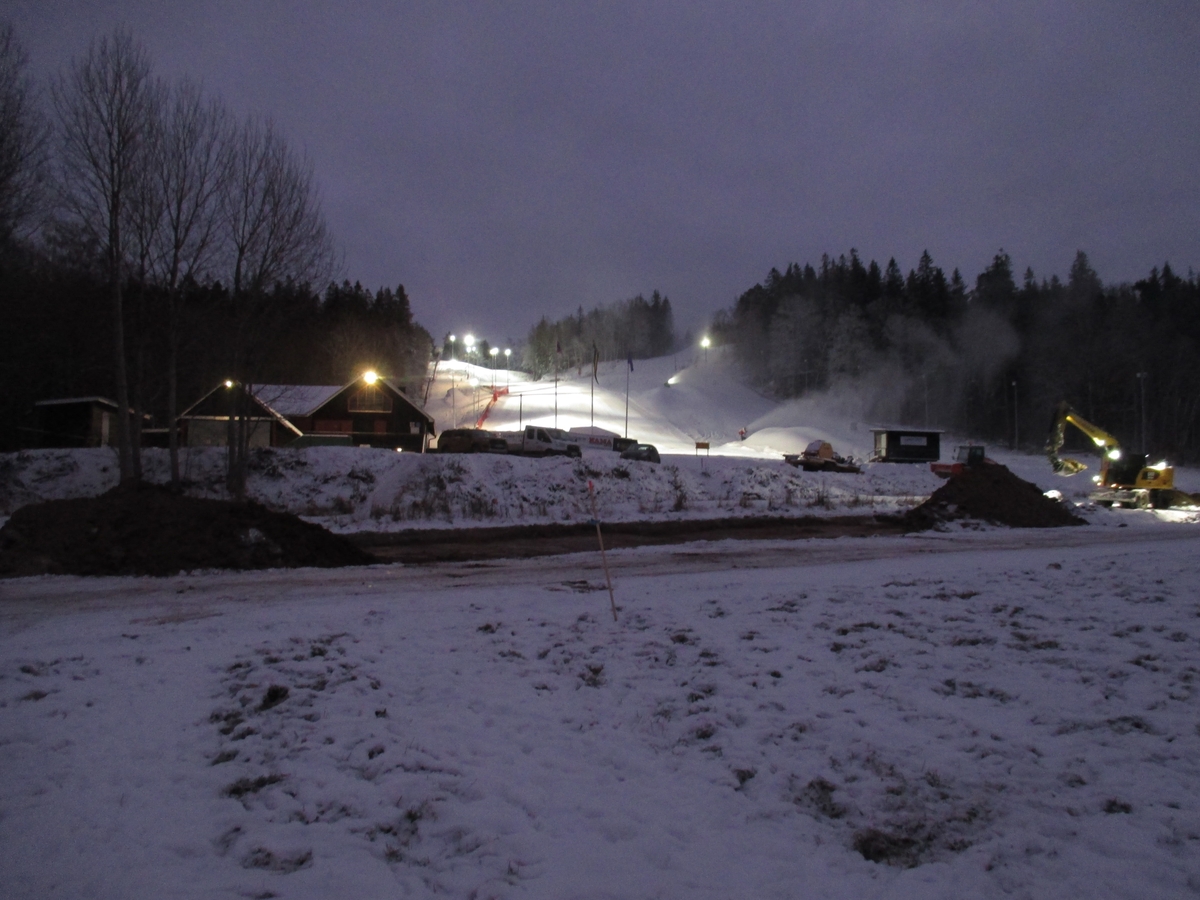 Översiktsfoto en tidig decembermorgon i mörker, blåst och kyla vid Järabacken. I förgrunden schaktövervakning i samband med anläggandet av den nya parkeringsplatsen.