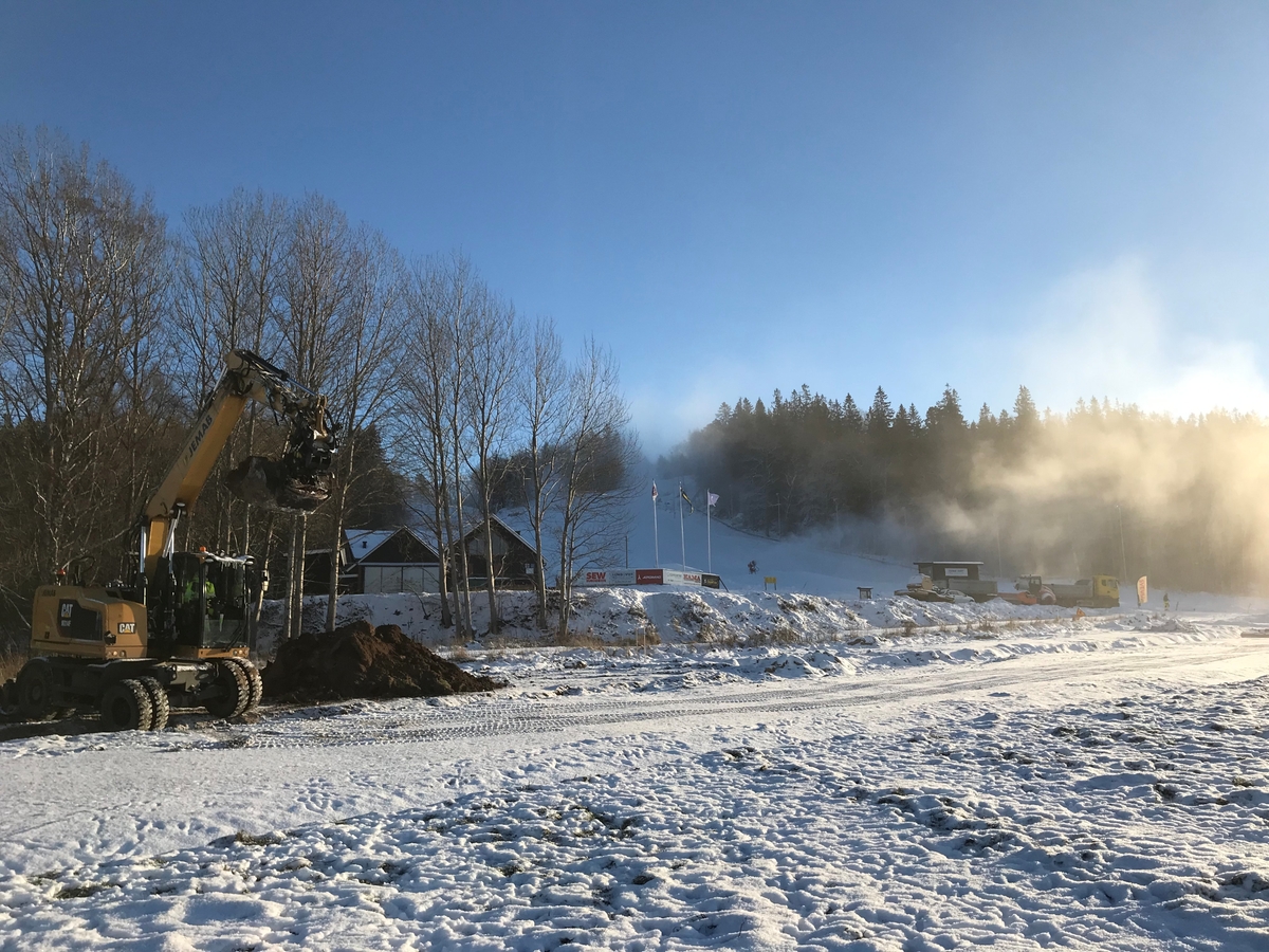 Översiktsfoto en solig morgon i snö och kyla med pågående schaktövervakning vid Järabacken.