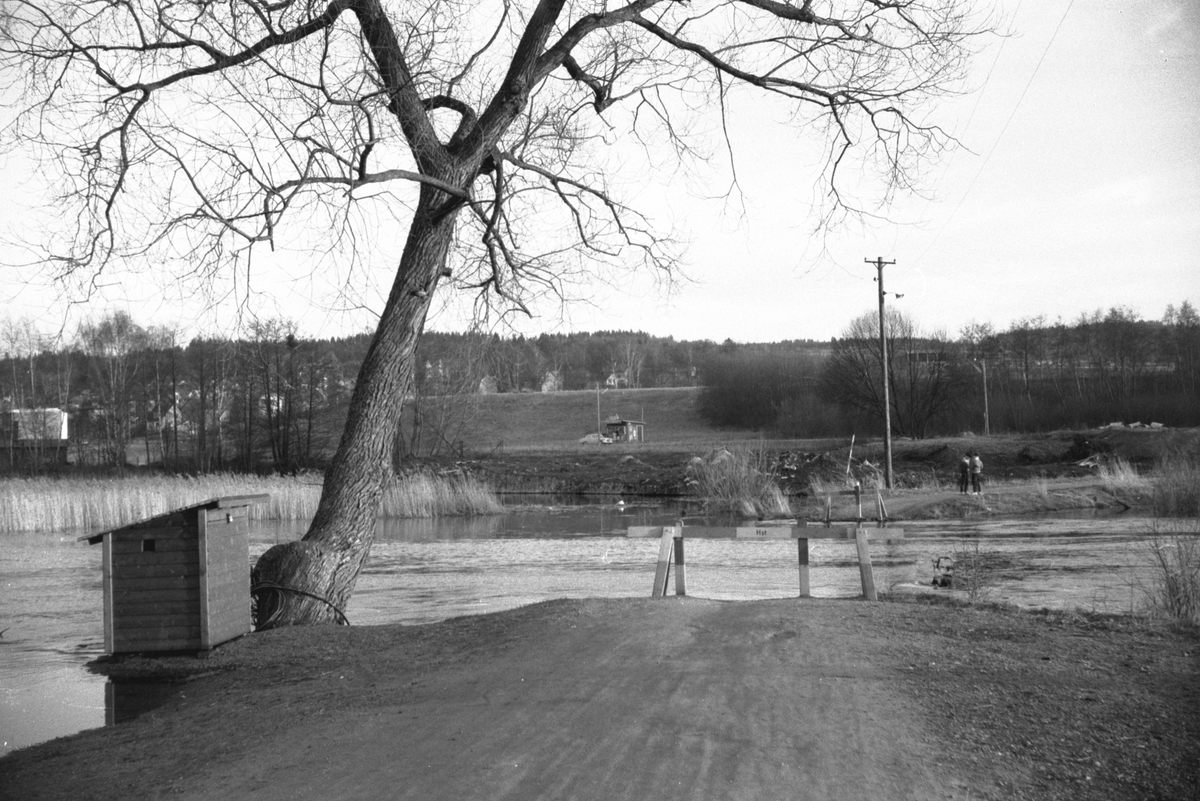 Vid Rumlaborg har Huskvarnaån svämmat över, Kavlabron är borta och vägen avstängd. I bakgrunden har en bil stannat på Häradsvägen vid en kiosk.