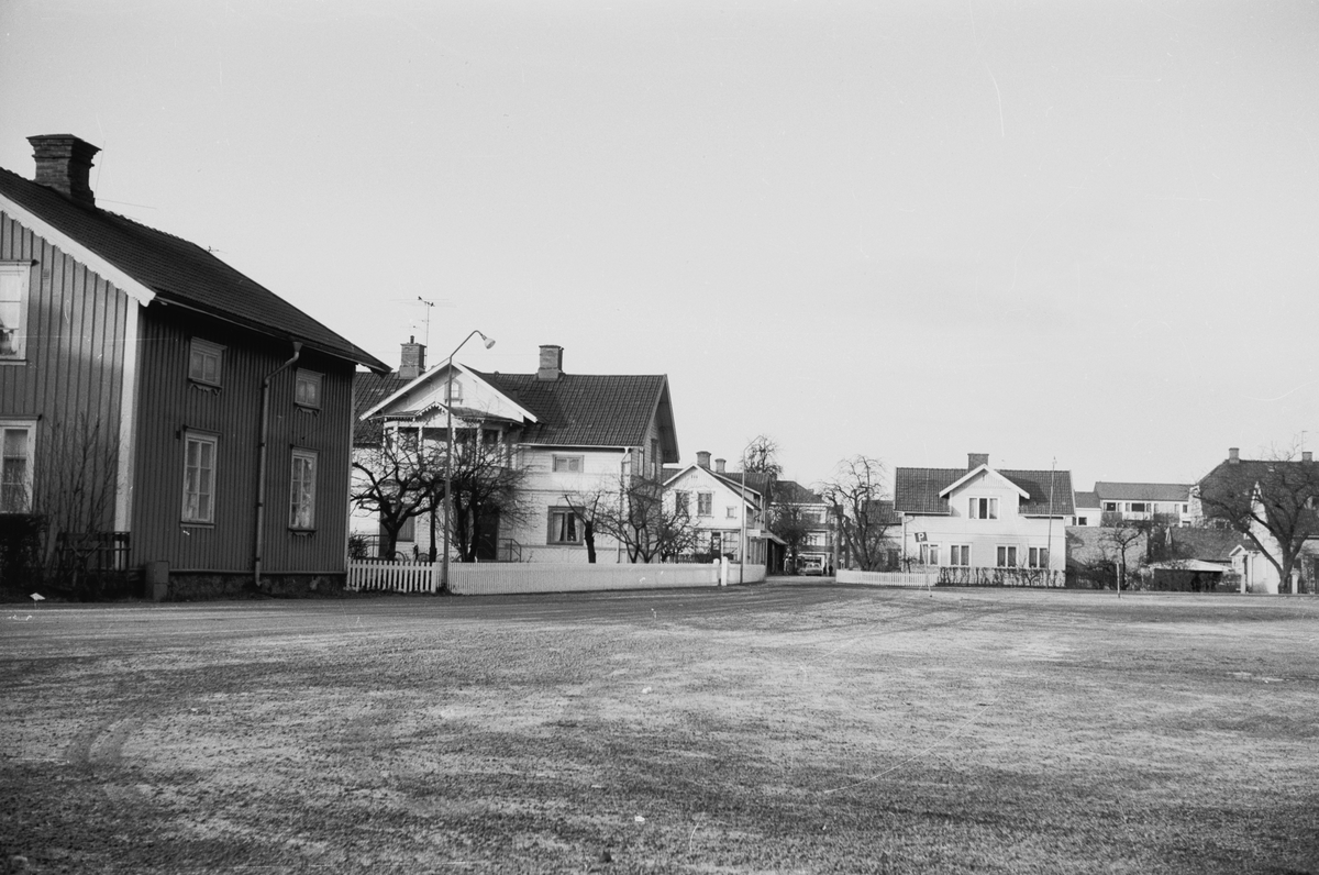 Bostadshus vid Bruksgatan i Huskvarna, sett från parkering vid Husqvarna AB. Centralbageriet finns i huset längst bort i mitten av bilden.