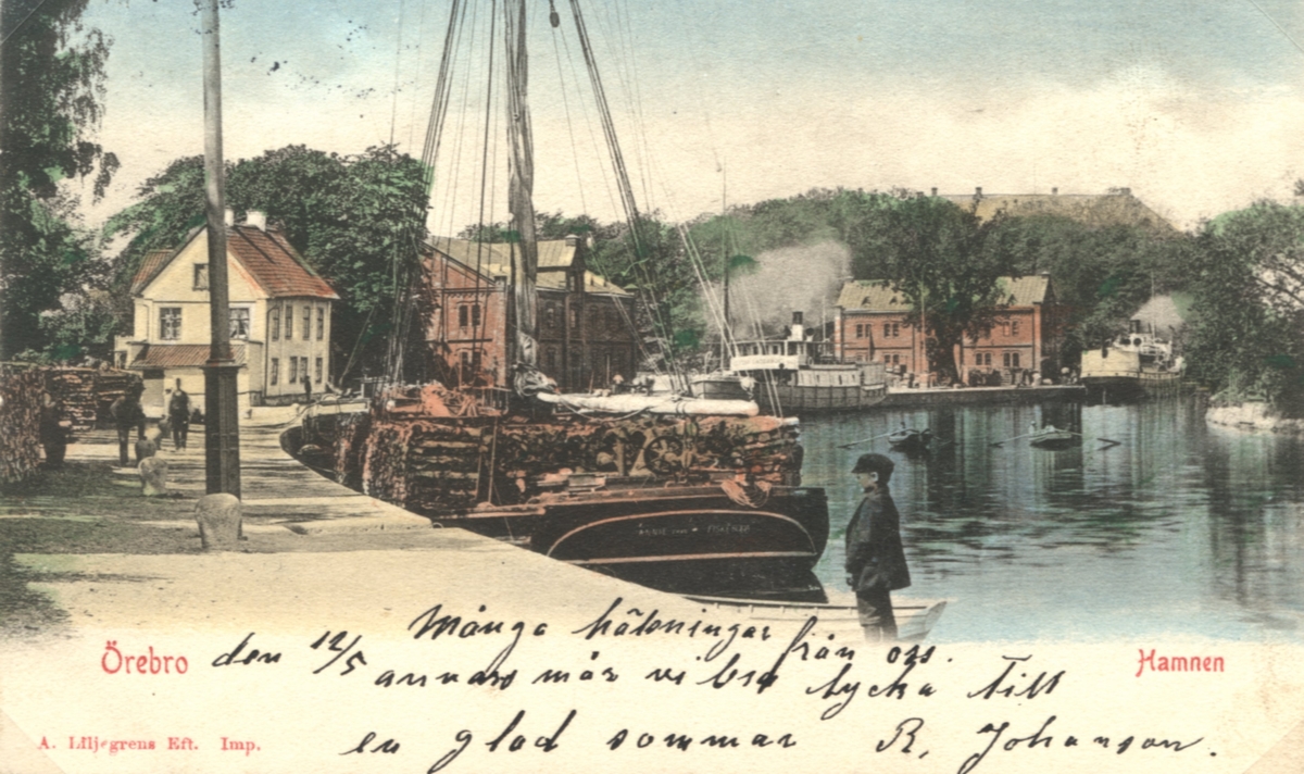 "Örebro Hamnen [tryckt] den 12/5 Många hälsningar från oss. annars mår vi bra lycka till en glad sommar R Johanson."