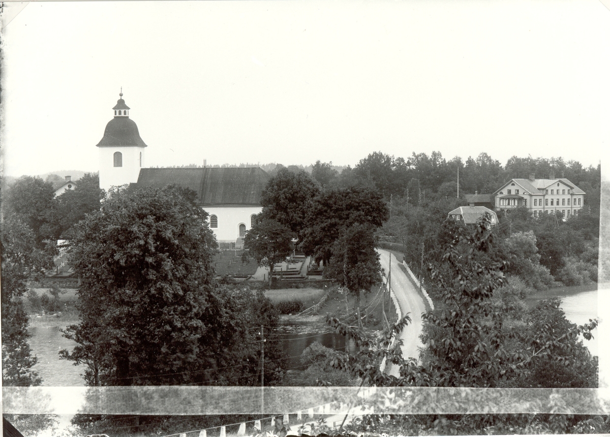Hjorteds kyrka med sjön Hjorten till vänster, till höger syns herrgården.