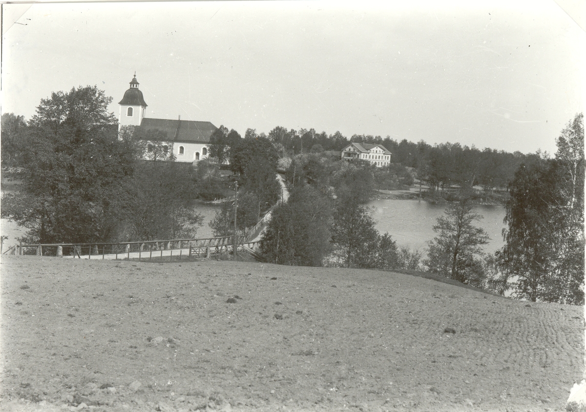 Odlingslandskap i Hjorted, i bakgrunden skymtar kyrkan.